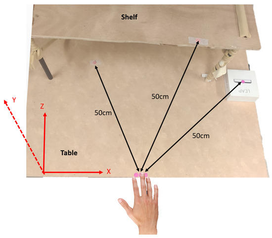 The participants were randomly assigned to three groups (N = 10 per group). Each group experienced the cues provided in a varied sequence to ensure randomness. Seated comfortably on a chair, every participant faced a table where the box was situated. A comprehensive demonstration of the cueing modalities was conducted by the researcher. This entailed the researcher orchestrating the subject’s hand movements toward and away from the target box, placed at different locations and heights (but maintaining the 50 cm aerial distance from the initial position of the hand), while auditory or tactile cues were concurrently activated. During this demonstration phase, the researcher elucidated the significance of the cues, meticulously explicating their relevance and purpose in tandem with the hand’s motion. This step was taken to foster familiarity and understanding among the participants. Following the demonstration, the participants were instructed to place their right hand at the designated starting point, defined by three distinct stickers (Figure 2). Subsequently, prompted by a verbal “go” from the researcher, the participants embarked on the task of locating the box. The trial was iterated three times, corresponding to each cueing modality. For each modality, the box’s location was altered among the three positions depicted in Figure 2 (maintaining 50 cm from the starting position of the hand). After the culmination of each trial, the participants rated their satisfaction with the respective cueing modality.