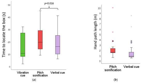 Statistically significant differences were observed in the time it took the subjects to complete the task among the three cueing modalities (p = 0.034; Figure 3a). A subsequent post hoc analysis revealed a statistically significant prolonged duration for locating the box using pitch sonification compared to verbal cueing (p = 0.016; r = −0.323). Conversely, no statistically significant differences were found in the hand path lengths between verbal and pitch sonification cueing (p = 0.082; r = −0.317), although a trend toward a lengthier path was noted with pitch sonification (Figure 3b).