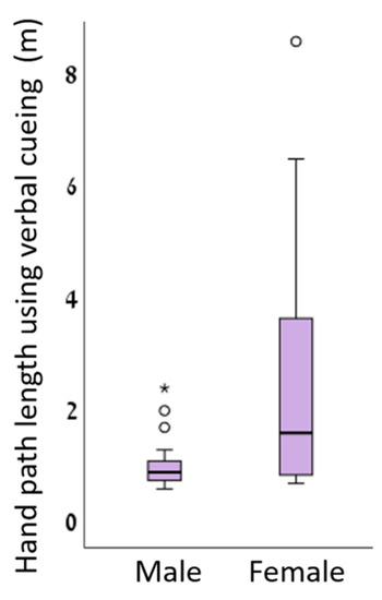 Hand travel path lengths for men (N = 19) compared to women (N = 11) when assisted by the verbal cueing modality. Outliers and extreme values are often represented with circles and asterisks, respectively.