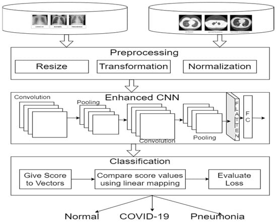 Respiratory system symptoms are the first indicator of pneumonia []. An X-ray of the chest, a CT scan, a blood gas analysis, and a complete blood image are all methods used to diagnose pneumonia. Medical professionals can view the internal structures of the body using chest X-rays and computed tomography (CT) images. It is possible for medical professionals to fail to diagnose minor lesions []. It has been shown that chest X-ray images and CT scans are sensitive to pneumonia and infectious diseases, like COVID-19 [].