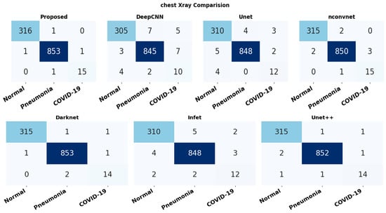 Figure 5 shows the confusion matrix for the chest X-ray dataset. The proposed model is compared with the existing models DeepCNN [], Unet [], nCONVnet [], Darknet [], infet [], and Unet++ []. The proposed model accurately classifies 316 out of 317 and misclassifies 1 for the Normal class, accurately classifies 853 cases out of 855 and misclassifies 2 for Pneumonia class, and accurately classifies 15 out of 16 and misclassifies 1 for the COVID-19 class. The DeepCNN model accurately classifies 305 for the Normal class, accurately classifies 845 cases for Pneumonia class, and accurately classifies 10 for the COVID-19 class. The Unet model accurately classifies 310 for the Normal class, accurately classifies 848 cases for Pneumonia class, and accurately classifies 12 for the COVID-19 class. The nCONVnet model accurately classifies 315 for the Normal class, accurately classifies 850 cases for the Pneumonia class, and accurately classifies 15 for the COVID-19 class. The Darknet model accurately classifies 315 for the Normal class, accurately classifies 853 cases for the Pneumonia class, and accurately classifies 14 for the COVID-19 class. The infet model accurately classifies 310 for the Normal class, accurately classifies 848 cases for the Pneumonia class, and accurately classifies 12 for the COVID-19 class. The Unet++ model accurately classifies 315 for the Normal class, accurately classifies 852 cases for the Pneumonia class, and accurately classifies 14 for COVID-19 class. From Figure 5, we observed that the proposed model most accurately classifies the chest X-ray class followed by the Unet++ and Darknet models.