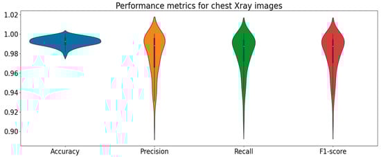 The overall performance of the chest X-ray dataset is shown in Figure 6. Each violin plot’s width corresponds to the frequency of the mean intensity. In general, the probability that the images have the corresponding mean intensity increases with the width of the violin plot. The intensity distribution still exhibits variance. The accuracy of the multi-class lung infection classification from the X-ray images is99.8%. These findings demonstrate how effectively the models identify lesions in chest X-ray images.