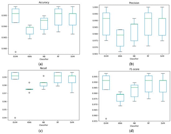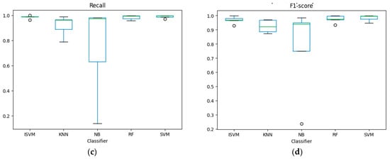 Comparison of classifier performance on the chest X-ray dataset. (a) Accuracy; (b) precision; (c) recall; (d) F1-score.