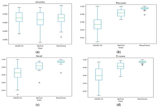 CNN models achieve high accuracy for image datasets by adjusting weights and parameters [,]. In [], the authors implemented the CNN model and achieved 70% classification accuracy. Similarly, the CNN model was implemented to classify pneumonia cases with 98% accuracy []. The Inception v3 [,] model also identified as a potential model to classify pneumonia []. Other studies implemented nine different transfer learning approaches to classify COVID-19 and pneumonia and achieved 95% accuracy []. Using EMCNet to extract the features and later applying the ensemble approach to classify COVID-19 cases achieved an accuracy of 98.91% []. Furthermore, transfer learning classifiers help to identify COVID-19 with an accuracy of 81% [].