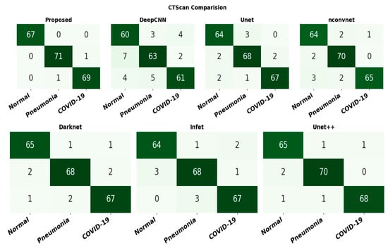 Figure 9 shows the confusion matrix for the CT scan dataset. The proposed model is compared with the existing models DeepCNN [], Unet [], nCONVnet [], Darknet [], infet [], and Unet++ []. The proposed model accurately classifies 67 out of 67 for the Normal class, accurately classifies 71 cases out of 72 and misclassifies 1 for the Pneumonia class, and accurately classifies 69 out of 70 and misclassifies 1 for the COVID-19 class. The DeepCNN model accurately classifies 60 for the Normal class, accurately classifies 63 cases for the Pneumonia class, and accurately classifies 61 for the COVID-19 class. The Unet model accurately classifies 64 for the Normal class, accurately classifies 68 cases for the Pneumonia class, and accurately classifies 67 for the COVID-19 class. The nCONVnet model accurately classifies 64 for the Normal class, accurately classifies 70 cases for the Pneumonia class, and accurately classifies 65 for the COVID-19 class. The Darknet model accurately classifies 65 for the Normal class, accurately classifies 68 cases for the Pneumonia class, and accurately classifies 67 for the COVID-19 class. The infet model accurately classifies 64 for the Normal class, accurately classifies 68 cases for the Pneumonia class, and accurately classifies 67 for the COVID-19 class. The Unet++ model accurately classifies 65 for the Normal class, accurately classifies 70 cases for the Pneumonia class, and accurately classifies 68 for the COVID-19 class. From Figure 9, we observed that the proposed model most accurately classifies the chest X-ray class, followed by the Unet++ model.