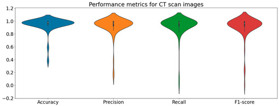 The overall performance of the CT scan dataset is shown in Figure 10. Each violin plot’s width corresponds to the frequency of the mean intensity. In general, the probability that the images have the corresponding mean intensity increases with the width of the violin plot. The intensity distribution still exhibits variance. The accuracy of the multi-class lung infection classification from the CT scan images is99.9%. These findings demonstrate how effectively the models identify lesions in CT scan images.