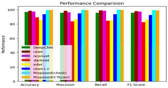 The results of the comparison, which was performed in terms of accuracy, recall, precision, AUC, and F1 score, are displayed in Figure 13. The table shows that the suggested model exceeds all other models taken into consideration in terms of accuracy. The research of [] and [] likewise used CT scan and X-ray images, and achieved accuracy rates of 98.23% and 99.87%, respectively; however, they used binary categorization. The Darknet model was utilized in the study of [], which solely used X-ray images, and 96.42% accuracy was attained. In contrast to our proposed work, which combined CT scan and X-ray images, the author of [] reported an accuracy of 94.47% for the infet model. Our proposed work employed 5935 CT scan images and 1043 X-ray images and reached 99.9% and 99.8% accuracy, respectively, whereas the author of [] used both CT scan and X-ray images and achieved 99.57% and 99.47% accuracy, respectively. Our proposed model, however, has the highest accuracy and precision values for the three-class categorization of chest CT images and X-ray images.
