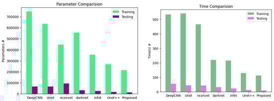 Figure 14 shows the computational complexity in terms of the number of parameters and the time. From Figure 14, it is observed that the proposed model exhibits a lower number of parameters and takes less time to process. Depth-wise separable convolution helps in reducing the parameters and improves the performance of the model.