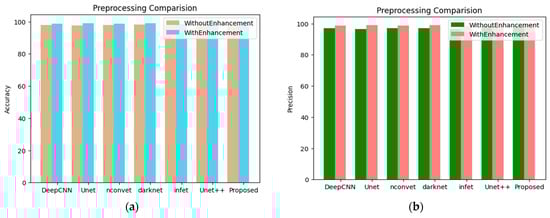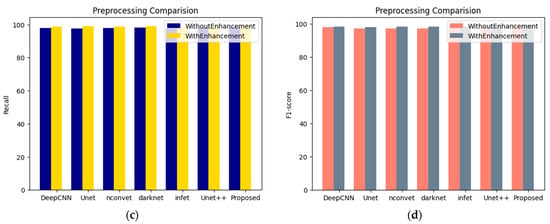 Figure 15 shows the comparison results for models with and without image processing. We compared the performance metrics, i.e., the accuracy, precision, recall, and F1-score for the existing models, to the proposed model with and without image processing. For the proposed model, the accuracy without image processing is 98.46%, and with image processing it is 99.90%. The proposed model achieved the highest accuracy, followed by Unet++ with an accuracy of 99.57% with image processing and 98.26% without image processing.