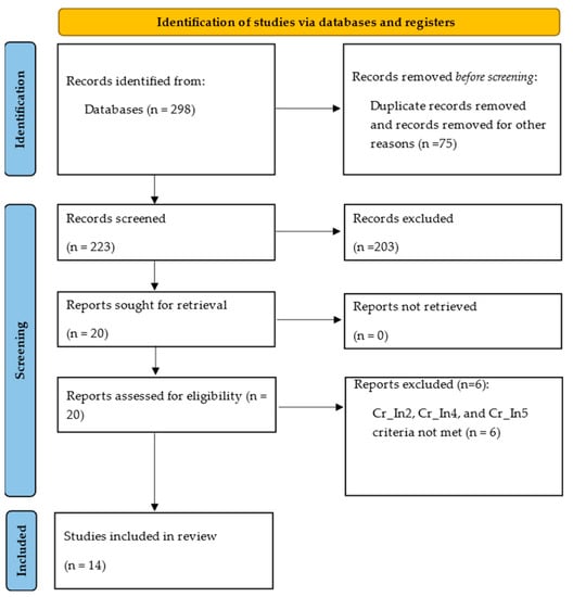 We obtained 91 articles from PubMed, 36 articles from IEEE Xplore, 31 from Cochrane Library, 100 from Google Scholar, and 40 from EBSCO. The sum of these results produced 298 articles. After removing duplicate articles and those written in languages other than English and Spanish, 223 articles remained. Later, the title, keywords, and abstracts of these 223 articles were reviewed and 20 articles were selected. Those articles were read and checked in detail, and only 14 articles were included in the review because 6 articles did not meet the Cr_In2, Cr_In4, and Cr_In5 criteria. Figure 1 shows this process using the guidelines defined by Kitchenham et al. [] and Ali et al. [].