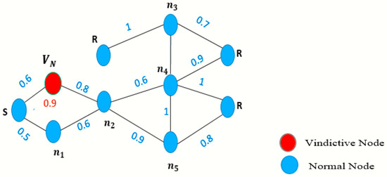 Figure 1 shows the schematic representation of data-forwarding attacks in a multicast WMN. In Figure 1, the disruptive behavior of a vindictive node is shown. The actual metric value of a link ( from a source to is 0.6; instead, announces the false metric value of 0.9, so that may choose as an upstream forwarder for forwarding packets from source to a set of multicast receivers (). The vindictive node builds the link among the acquaintances as a neighbor and attempts to confuse the network transmissions between so that the entire multicast transmission may collapse. In this article, the terms ‘attacker’ and ‘vindictive’ convey the same meaning of a malicious node.