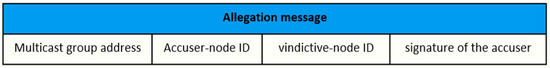 Using an orthogonal projection algorithm, every node estimates whether its upstream forwarder node drops the received packets over successive time intervals. The above Equation (10) in step 7 is computed repeatedly for every one-hop upstream neighbor for n iterations to observe the behavior of malicious nodes. After nth iteration, by validating the final projection value with the boundary limitation based on Equation (2), the values that are bounded outside of the normal node ranges are marked as vindictive values. Finally, the honest accuser node (a node that accuses the vindictive node) declares the corresponding upstream forwarder node as a malicious node as per the computed knowledge. Therefore, the malicious node is declared as a vindictive node by broadcasting an allegation message in the network. Figure 2 shows the format of an allegation message.