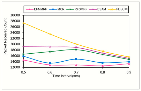 It can be observed in Figure 4 that the average number of packets received by the multicast receivers under various time intervals was higher in PDSCM compared to that of existing multicast protocols, as the multicast packets were securely delivered in the mesh network. Due to accurate design and secured forwarder selection during the route discovery process, the proposed protocol achieved a better outcome. In addition, since the PDSCM protocol is a preventive-based approach, the packet received count was high. Hence, the network did not suffer from initial packet losses until the finding of malicious nodes, and the packet received count of the proposed protocol was higher than those of compared protocols. It outperformed EFMMRP by 57.1%, MCR by 41.8%, RFSMPF by 24.1%, and ESAM by 18.4%.