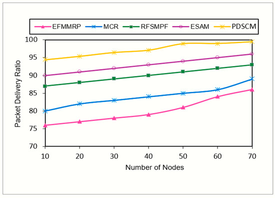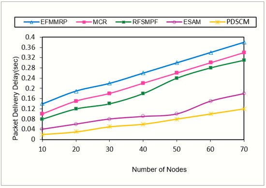 It can be observed from Figure 7 that packet delivery delay increased slowly as the number of nodes increased. The proposed protocol outperformed the existing protocols by reporting an average packet delivery delay of 0.06 s when the number of nodes increased gradually. The vindictive node elimination from the communication path ensured a minimum end-to-end delay path that sent the highest bits per second to the receivers. Hence, the packet delivery time was greatly reduced in PDSCM. On an average, PDSCM incurred less delay than existing protocols, outperforming EFMMRP by 76%, MCR by 72%, RFSMPF by 70%, and ESAM by 40%.