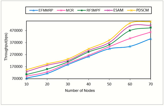 Figure 6 shows that the throughput of the network increased steadily when the network size increased over successive intervals. Due to secure forwarder node selection, the packet arrival time was reduced. In addition, as every node’s communication behavior was analyzed based on its packet deliverance capability and on current network environmental variations promptly, the vindictive nodes were accurately identified and removed from the network. This increased network throughput. The proposed PDSCM protocol had better throughput than existing protocols, viz., outperforming EFMMRP by 11.6%, MCR by 8.4%, RFSMPF by 4%, and ESAM by 2.2%.