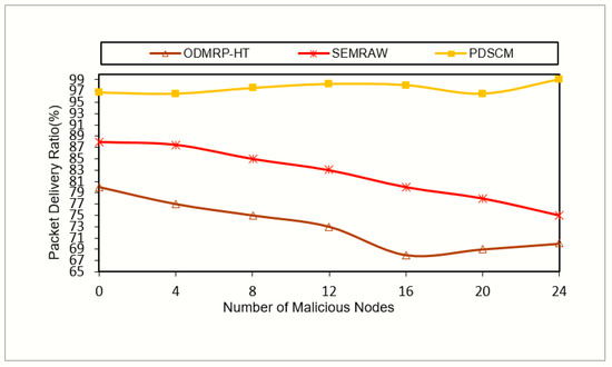 Figure 7 shows the performance comparison of PDSCM with a varying number of malicious nodes, in terms of the percentage of packets delivered. From Figure 8, it can be observed that as the number of malicious nodes increased, there was a sudden decrease in the packet delivery ratio (when the number of a malicious nodes reached 20, the PDR decreased from 98% to 96%). This is because as the number of malicious nodes increases, some multicast receivers become completely inaccessible and they are not able to receive data. The proposed protocol showed better results than the conventional secure multicast protocols, viz., ODMRP-HT and SEMRAW.