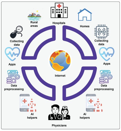 In the last two decades, many technologies have been researched for implementing a single connected system that can communicate in real time regardless of the distance. Such systems usually have a complex structure with many parts. One unique and critical part is the implantable microchip that continuously collects data without human intervention. By using such a system, for example, a cardiologist can be informed within seconds of the changes in the performance of the heart in patients with cardiovascular diseases and help prevent a heart failure, which can lead to even death. Figure 1 shows the system concept for the normal case for data acquisition and data transfer over the Internet. The system has six main parts: a unique data source, including hospitals, homes, and rural areas; data collection using microchips, implants, and wearables; data transfer using specialized apps; preprocessing; and recording of conversations with AI helpers and physicians for real-time diagnosis and treatment.