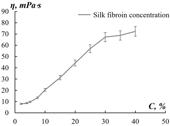 It is preferable to use non-toxic solvents to obtain SF fibrous matrices for tissue engineering by electrospinning [31,32,33]. When using aqueous solutions, the most important factor determining the possibility of molding is the concentration of the solution [34,35]. Regenerated SF obtained using concentrated LiBr solutions, according to the procedure described in Section 2.2, takes the form of random tangles and α-helices in aqueous solutions [27,36,37], which weakly interact with each other. The formation of the mesh required for fiber formation is possible only at rather high SF concentrations. The concentration dependences of the dynamic viscosity of fibroin aqueous solutions are shown in Figure 1.
