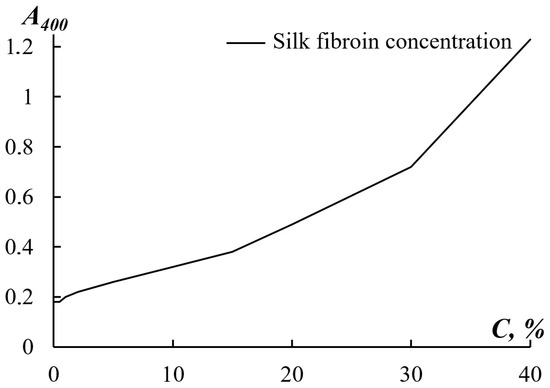 A sharp slowdown in viscosity growth at concentrations above 30% was found (Figure 1). This may be associated with the beginning of conformational rearrangements, namely, fibroin from the globular conformation occurring in dilute solutions transformed to the anisotropic α-helix conformation that resulted in the formation of β-folded structures. This assumption was confirmed by the results of a nephelometric study, which showed a sharp increase in the optical density of the solution in this concentration range (Figure 2).