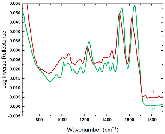 FTIR spectrum correction for internal reflectance, log 1/R, of the 80% alcohol-treated electrospun fibrous matrices from regenerated SF (1) and the untreated electrospun fibrous matrices (2).
