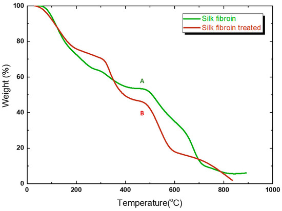 The untreated and 80% alcohol-treated electrospun fibrous matrices showed a weight loss trend with increasing temperature in the TGA plots (Figure 4). The degradation of the untreated and alcohol-treated matrices heated up to 150 °C can be attributed to the loss of bound water. In this region, the fibrous matrix sample lost its weight more slowly than the untreated sample. Water molecules bound to the β-sheet (silk II) of the fibroin structure were shown to be much stronger. The main weight loss for both the untreated and treated samples was observed in the range of 150–450 °C and was attributed to the degradation of the silk structure.
