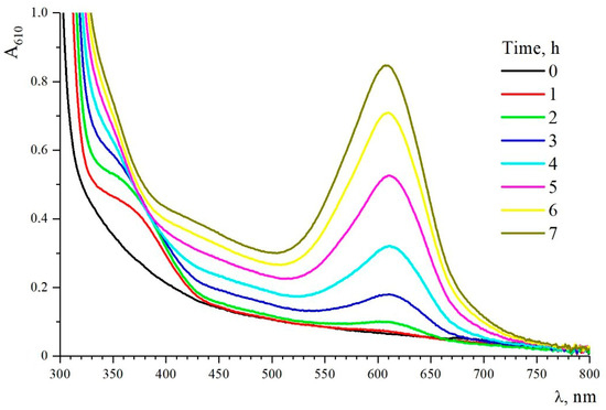 The kinetic curves obtained on a vibration viscometer are shown in Figure 8. The kinetic curves show changes in the viscosity of the SF solutions during the cross-linking of Gp at the same concentration of the cross-linking agent (10.9% by weight of fibroin) in a wide range of SF concentrations. Within 24 h, a marked change in viscosity was observed only for concentrations above 10%. During measurements for 42 h in the presence of Gp, even the 40% SF solutions did not lose their flow ability. However, the color change to green or blue (depending on the concentration of the solution), indicating a secondary reaction with the formation of a product being absorbed in the λ = 600 nm region.