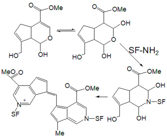 Another way to prevent solubility and improve water resistance and mechanical properties is chemical cross-linking with non-toxic cross-linking reagents. It is well known that chemical cross-linking of chitosan with the naturally occurring cross-linking reagent genipin causes gelation in its solutions. Upon post-processing, it leads to the production of water-insoluble fibrous, film materials, and porous cryogels [18,19]. There are different ideas about a mechanism of reaction of amino-containing biopolymers with Gp [43,44,45,46]. The interaction of SF with Gp led to an increase in viscosity, as well as resulted in an appearance of absorption in various regions of the spectrum, including the visible region (Figure 5) and blue staining of the material. Considering this and summarizing the literature data, we propose the following scheme for cross-linking fibroin with genipin (see Figure 6).
