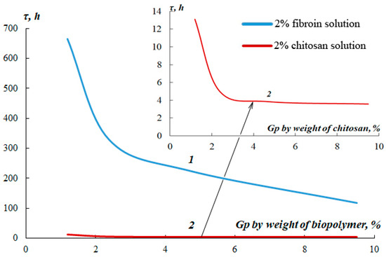 The gelation process in equiconcentrated fibroin and chitosan solutions was also investigated. Dependence of gelling time in the 2% SF solutions at pH 7.3 and in the chitosan solution at pH 5.6 during cross-linking with Gp on the cross-linking agent content is shown in Figure 7.