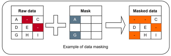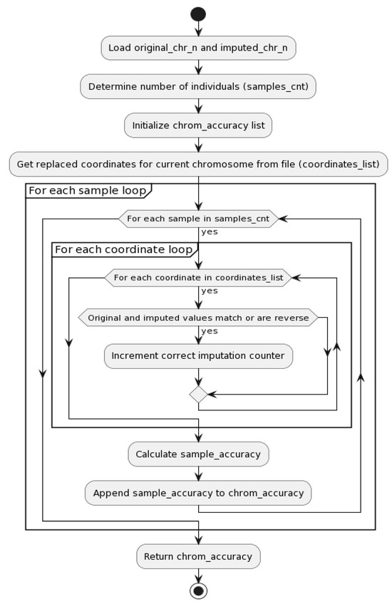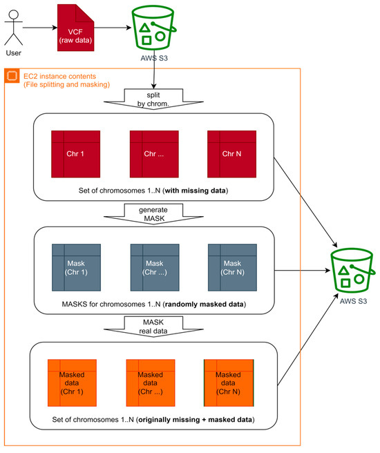 Figure 3 shows the input data masking scheme. This approach will allow for immediate accuracy in the assessment of imputed data for each chromosome, comparing the original and masked data. The main idea is to generate a “mask” with existing, well-known values. Those values will be used as the ground truth for the accuracy computation step. After applying “mask” to the original raw dataset, existing well-known values are marked as missing (in addition to already missed values), so we obtain masked data. It is used during accuracy computation to calculate the ratio of true positives.