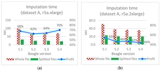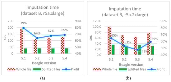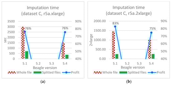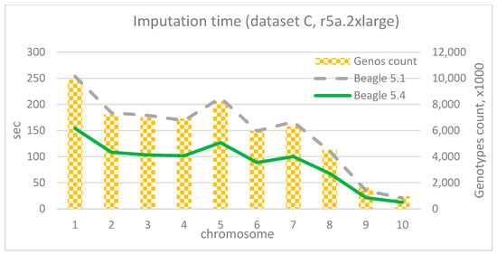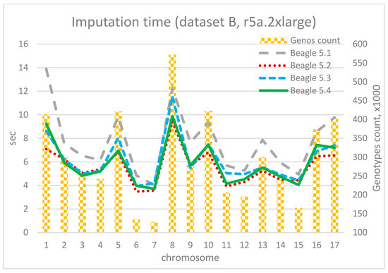 The imputation durations for each chromosome and corresponding chromosome lengths for 4 vCore and 32 Gb RAM (r5a.2xlarge) are depicted in Figure 13, Figure 14 and Figure 15. As observed from the charts, the only “outlier” is Beagle version 5.1, while the other versions have shorter execution times and display similar results compared to their adjacent versions. As the dataset size increases, the time advantage of the latest versions significantly grows. For instance, for the smallest dataset A, the time difference between Beagle 5.1 and, for example, Beagle 5.4 ranges from 0% to 20%. For dataset B, it is between −10% and 34%, and for the largest dataset C, the time difference between Beagle 5.1 and 5.4 (using EC2 = r5a.2xlarge) is 39–42% for each chromosome. In addition, it is easy to see a mostly linear dependency between imputation time and chromosome length.