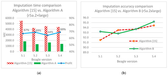 Imputation results comparison: (a)—imputation time for Algorithm [15] and Algorithm A (using r5a.2xlarge); (b)—imputation accuracy for Algorithm [15] and Algorithm B (using r5a.2xlarge).