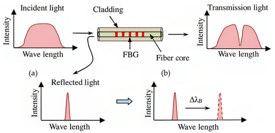 Fiber core and cladding of an FBG have distinct refractive indices. The FBG’s exposure to external turbulences, such as strain and temperature, alters the Bragg wavelength, which will be back-reflected while other components of the wavelength will pass through the FBG. (a) The incident light is transmitted through the FBG, and a narrow band is back-reflected. (b) Shifted back-reflected band after applying external disturbances (adapted from []).