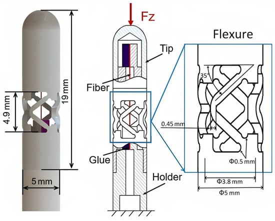The sensor incorporates two main components: a force-sensitive flexure based on the mechanism of sarrus linkage and a suspended optical fiber embedded with a 5 mm FBG element.