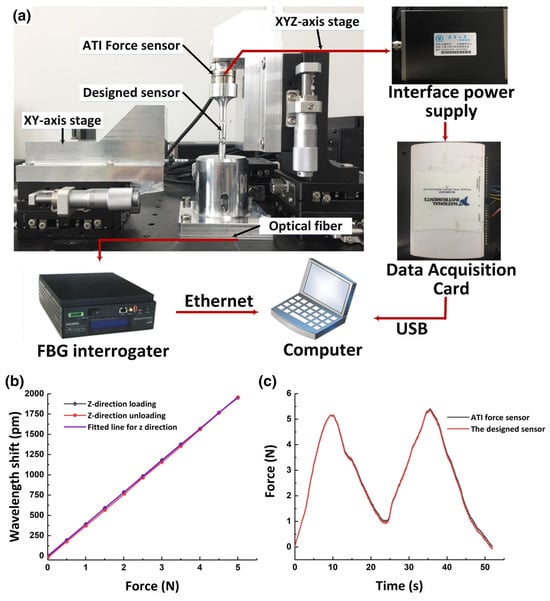 Figure 3a FBG interrogator with a sampling rate of 100 Hz and a wavelength resolution of 1 picometer (pm) was used to obtain the reflected wavelength that corresponds to the induced strain. In static force calibration, axial forces ranging from 0 to 5 N at 0.5 N intervals were applied, with corresponding FBG reflective wavelengths recorded. This process was repeated six times, and the average values during each loading step determined the force–wavelength relationship, shown in Figure 3b.