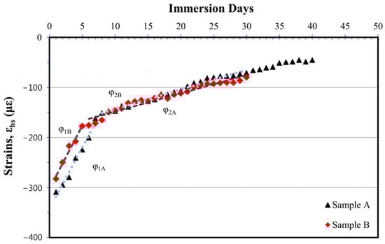 Induced strain during the hardening stage of 2 CPC specimens, namely Sample A and Sample B, revealed comparatively large compressive strains in the beginning. Over time, the strain became much smaller following two distinct linear paths of strain relief (adapted from []).