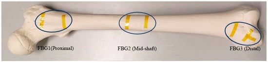 Intact femur with three longitudinal FBGs attached at proximal, distal, and middle regions of the femur using adhesives to measure strains (adapted from []).