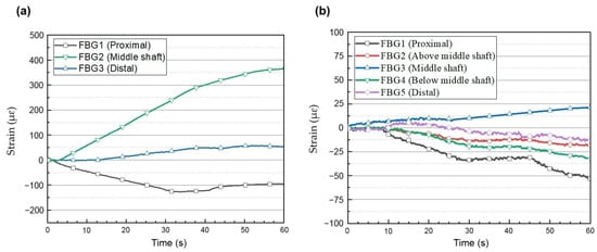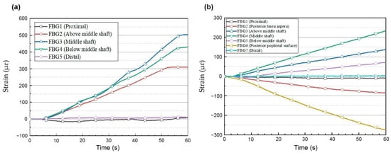 The subfigures show the FBGs’ responses to different loadings of the intact femur: (a) strain values measured using longitudinal FBG arrays on the intact femur and (b) strain values measured using coiled FBG arrays on the intact femur (adapted from []).
