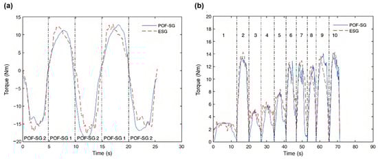 (a) Responses of POF-SGs and ESG during the knee flexion–extension workout with the impedance controller set at level 8. (b) Responses of POF-SGs and ESG for the knee extension exercise with the impedance controller ranging from 1 to 10 (adapted from []).