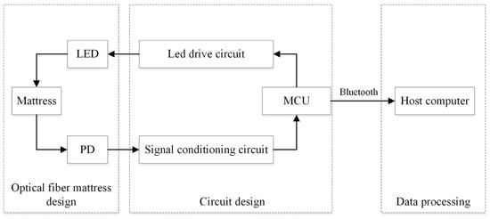To monitor sleep performance, Pengfei Han et al. examined the use of POF pressure sensors implanted in mattresses to evaluate respiratory and heart rate while proposing a method to increase pressure sensitivity by cutting fiber cladding and the portion of the core uniformly at 10 cm intervals []. The system can be broken down into three components: data processing, circuit design, and optical fiber mattress design (Figure 11).
