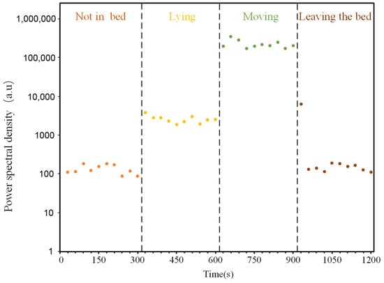 Power spectral density of four behavioral stages for sleep monitoring. The spectral energy is minimal when not in bed. The energy increases when lying still on the mattress, primarily by breathing and heartbeat. Slightly higher spectral energy compared to just lying when a person moves in bed. The spectral energy rapidly diminishes as they depart the mattress (adapted from []).