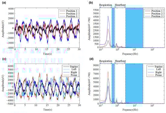 (a,b) Time series and power spectral density of different positions; the data from Positions 2 and 3 are more evident because they are closer to the heart. Since Position 1 is further from the heart, there are fewer heart rate signals in this situation. Positions 1, 2, and 3 have breathing rate and heart rate measurements that are somewhat near normal ranges. (c,d) Time series and power spectral density of different postures; in any posture, the respiratory signal is obvious. Due to the asymmetry of the heart’s placement within the human body, the right-side laying position produced the weakest heartbeat signal performance, while the supine and left postures demonstrated a more pronounced heartbeat signal performance (adapted from []).