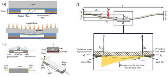 Naghmeh M. Bandari proposed a hybrid force sensor, which uses the sensing principle of piezoresistivity to estimate the deformation in the tissue and directly measure the contact force and intensity modulation in optical fibers (Figure 14a). The force sensor incorporates two piezoresistive force sensing elements, eight silicon structural elements, and two separate optical fibers. Each piezoresistive element consists of two copper shell electrodes and a piezoresistive film. When one of the optical fibers was connected to a light source, the other was connected to a photodetector []. The schematic of the three-dimensional (3D) hybrid force sensor is shown in Figure 14b. The basic sensing concept behind this design was to measure the loss of gap power by comparing the input power (Pi) of the first fiber with the output power (Po) of the second fiber (Figure 14c).