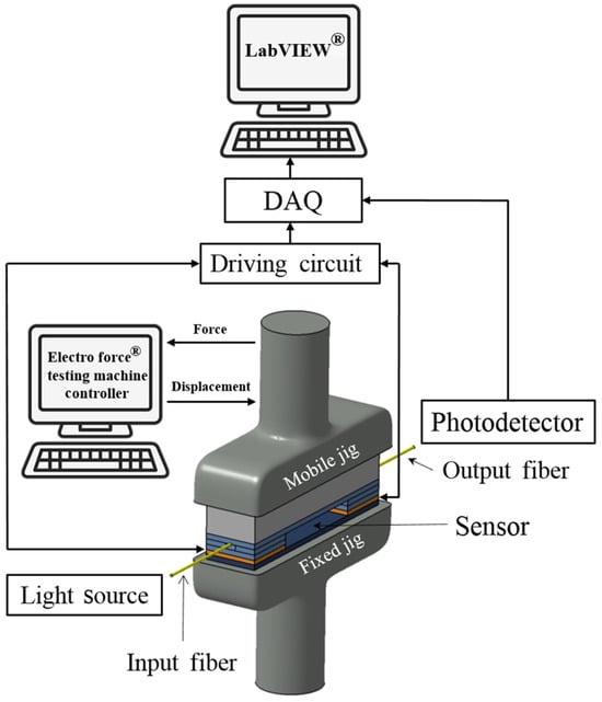 Figure 15 illustrates the schematic experimental system, depicting the entire proposed system along with its DAQ. The lower jig of the testing machine was secured and equipped with a force sensor, while the upper jig was movable and featured a displacement sensor.