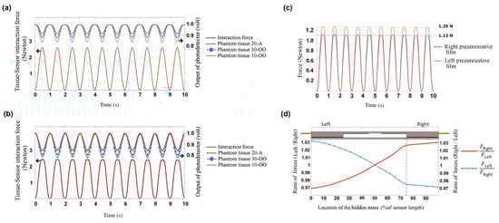 To validate the simulations, a series of experiments were conducted under identical conditions. Figure 16a compares the estimated changes in voltage output of the photodetector obtained through finite element analysis (FEA) with the measured voltage changes from experiments in simulation. Figure 16b illustrates measured changes in voltage from actual experiments conducted using the proposed sensor for three different tissue phantoms. The force ratio variation with respect to the location of the mass is shown in Figure 16c. Figure 16d illustrates a hidden mass in motion towards a piezoresistive film, causing a change in the force ratio. A higher ratio indicates proximity to the left film.