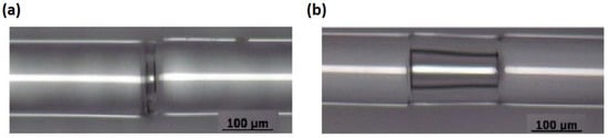 Greice et al. conducted a comprehensive study on FPIs, which primarily focused on the application of FPIs in strain sensing, with a particular focus on scenarios where temperature variations can potentially impact the accuracy of strain measurements []. Researchers used a Fujikura FSM-30S fusion splicer to create cylindrical air cavities by splicing short sections (25–650 μm) of capillary fiber between standard SMF. The splicing procedure involved attaching a long section of the capillary fiber to a single-mode fiber, cleaving the capillary fiber under an optical microscope to achieve the desired air-cavity length, and then splicing the cleaved side of the capillary fiber to another single-mode fiber. Typical images of air cavities were shown, with lengths of 25 μm (Figure 17a) and 200 μm (Figure 17b). The paper also explores the use of in-fiber FPIs in magnetic field sensing. Two configurations were proposed for magnetic field sensors based on in-fiber FPIs. The first configuration involved attaching the FPI to a magnetostrictive material, and the second configuration involved placing the FPI inside a small magnet.