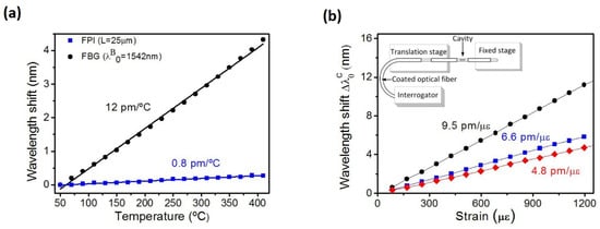 Several varieties of optical fibers have been used for the development of FPI sensors. Yoshino et al. fabricated an FPI sensor using single-mode fiber (SMF) by optically polishing and coating the two end faces with a multilayer of dielectric films. The single two-core fiber was employed to develop Fabry–Perot interferometric sensors for concurrent comprehensive measurement of temperature and strain. This FPI is made up of a pair of low-reflection Bragg gratings that are holographically written with a time-division multiplexing (TDM) technique. Various interesting and challenging FPI fabrication methods can be found in the literature [,,,].