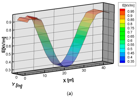 In order to obtain an overview of the distribution of the electric field and the measured magnetic field at the level of the area of interest considered, the measured values were imported into the TECPLOT program, a program that enables their three-dimensional representation. Thus, Figure 9a shows the overall distribution of the electric field in the area between the pole and the lines’ sag (that is, half of the distance between the two poles), and Figure 9b shows the distribution of the magnetic field in the same area.