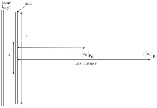 The is the maximum size the grid can have in pixels when objects are very close to the camera, while is the smallest size the grid will have when objects are at or beyond the . As illustrated in Figure 5, the grid will have the smallest size a for a detected object when the camera is at a point and a distance and distance , and the grid a will have a size b almost covering the whole image when the camera is at point and a distance . This configuration ensures that the grid adjusts well to the region along the pathway covered by the obstacle.