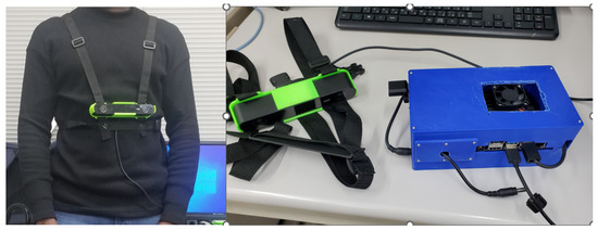 To test obstacle avoidance in real-time, we developed a wearable assistive device. The hardware component of our wearable assistive device comprises a single-board computer, the Jetson Nano, which serves as the central processing unit of the system, and a stereo camera system that provides depth perception, the ZED2 Camera [45]. The Jetson Nano is a powerful single-board computer that can serve as the brain of the system. It offers an integrated 128-core Maxwell GPU, quad-core ARM A57 64-bit CPU, and 4GB LPDDR4 memory, along with support for MIPI CSI-2 and PCIe Gen2 high-speed I/O. The ZED2 camera is a stereo camera system that provides depth perception. It can capture RGB images and generate a depth map of the environment. The ZED2 camera is mounted on the microcontroller system to capture the real-time visual input of the surrounding environment. The device is powered by a lithium-ion battery for charging laptop devices and configured to power the Jetson Nano, making it possible to power up our devices for 12 h. The ZED2 stereo camera uses the disparity calculated from the left and right images to determine the depth information obtained from the camera. The wearable device is presented in Figure 6, demonstrating how it is worn and the portable unit that can be carried around.