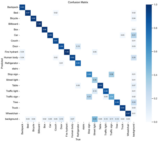 The customized YOLOv5 model demonstrated promising results in terms of both accuracy and speed. Its lightweight architecture facilitated deployment on the resource-constrained NVIDIA Jetson Nano device. In real-world testing scenarios, the model demonstrated the ability to accurately detect and classify obstacles in near real-time, making it well-suited for autonomous navigation tasks. The confusion matrix, precision, and recall graphs from training the model in Figure 7, Figure 8, and Figure 9, respectively, illustrate the model’s ability to predict and detect objects accurately.